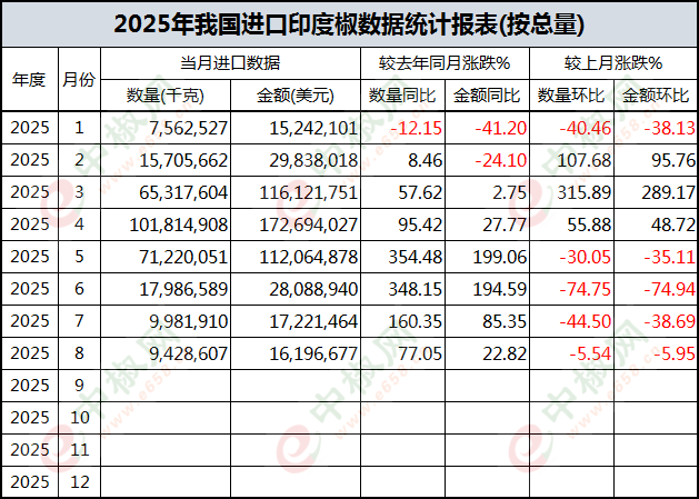 2025年8月印度椒进口数据(按总量)