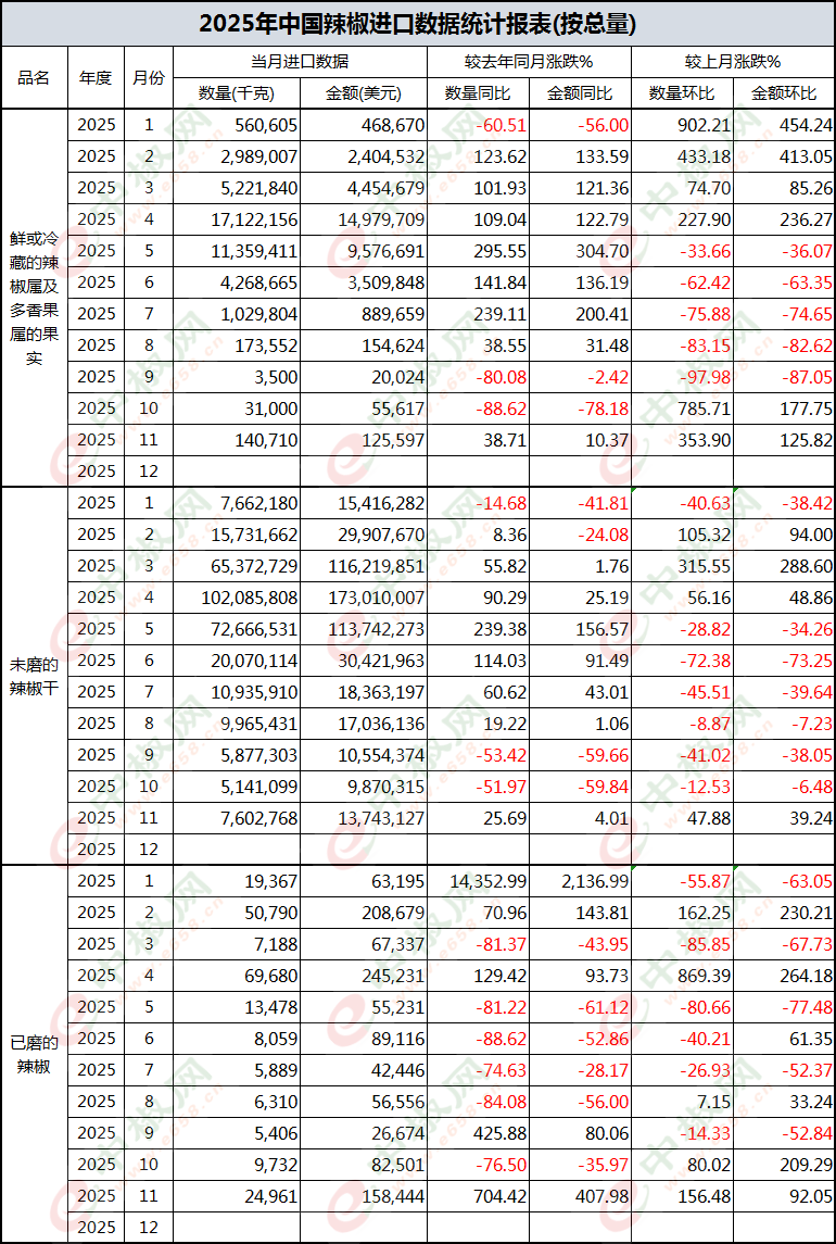 2025年11月辣椒进口数据(按总量)新