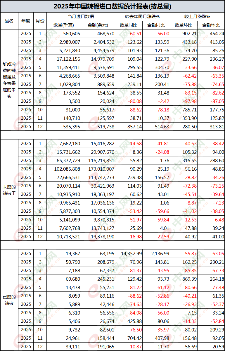 2025年12月辣椒进口数据(按总量)