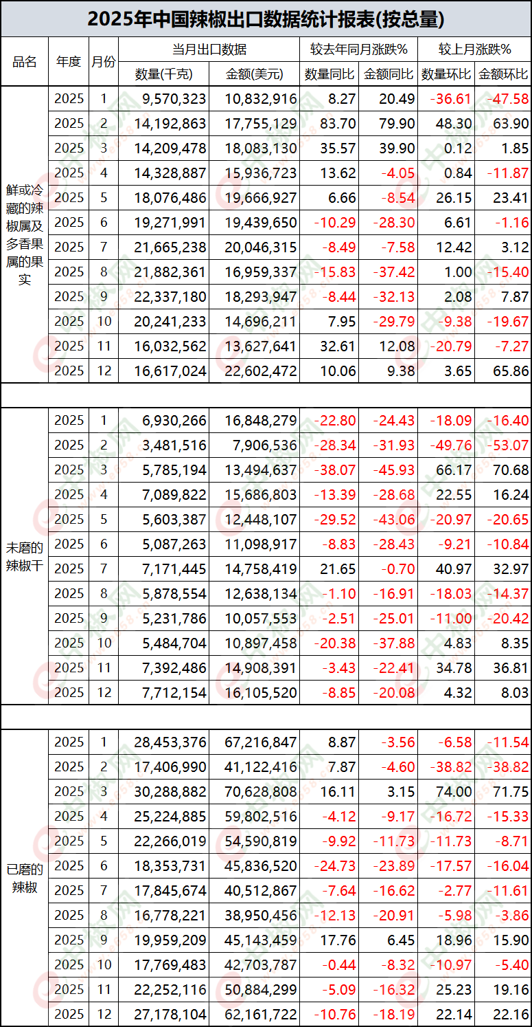 2025年12月辣椒出口数据(按总量)