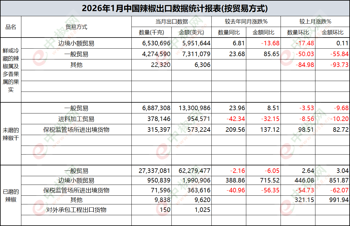 2026年1月辣椒出口数据(按贸易方式)