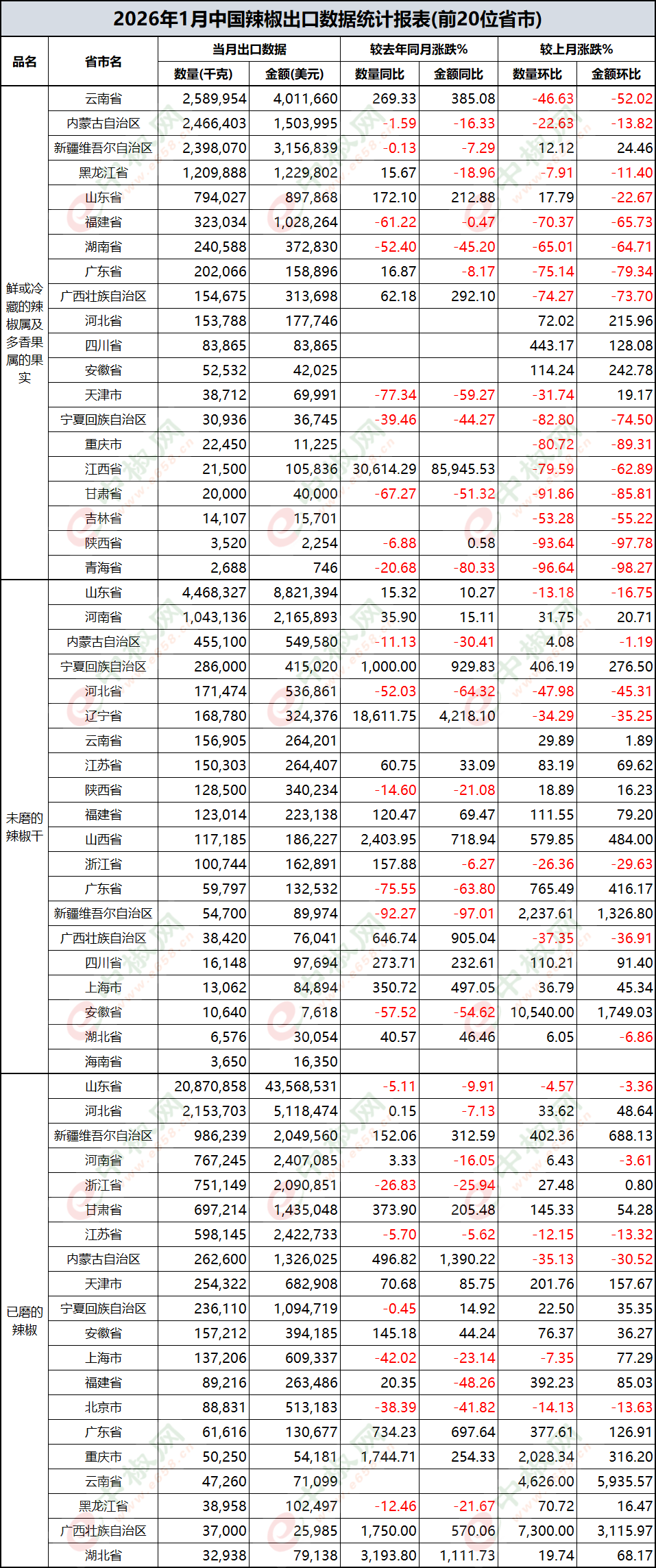 2026年1月辣椒出口数据(按省市)