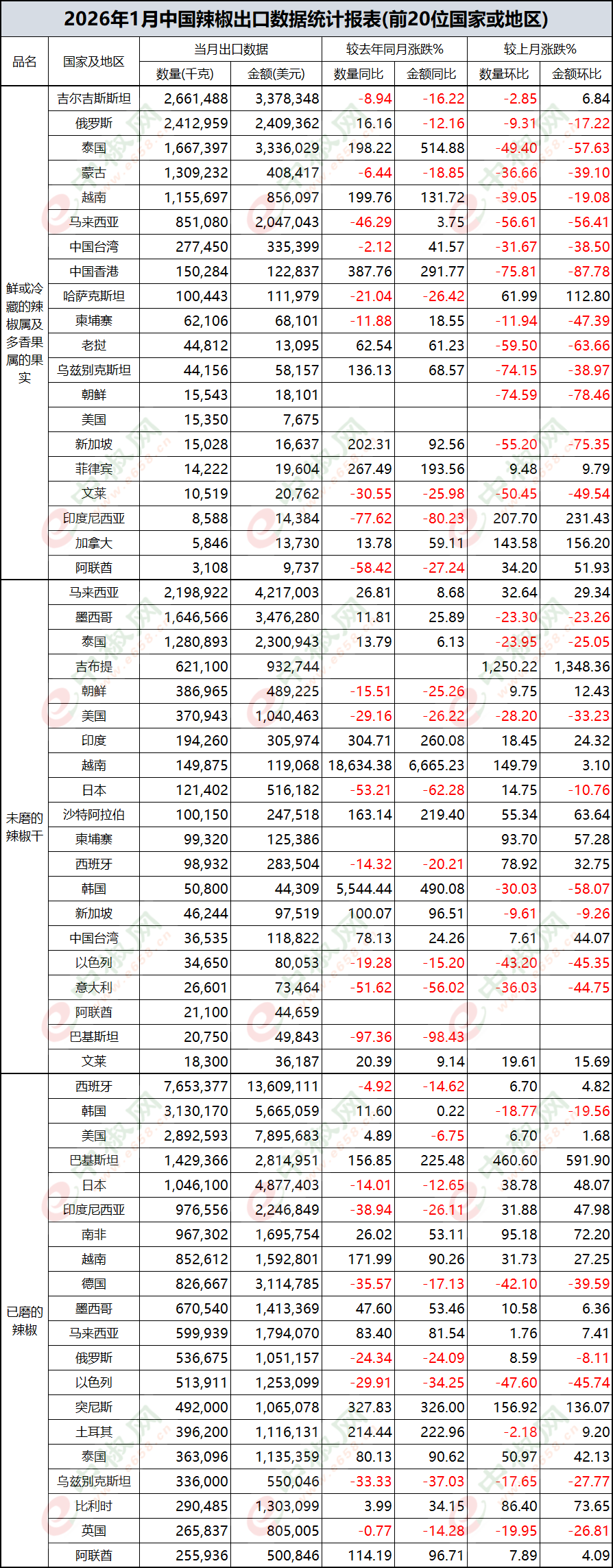 2026年1月辣椒出口数据(按国家/地区)