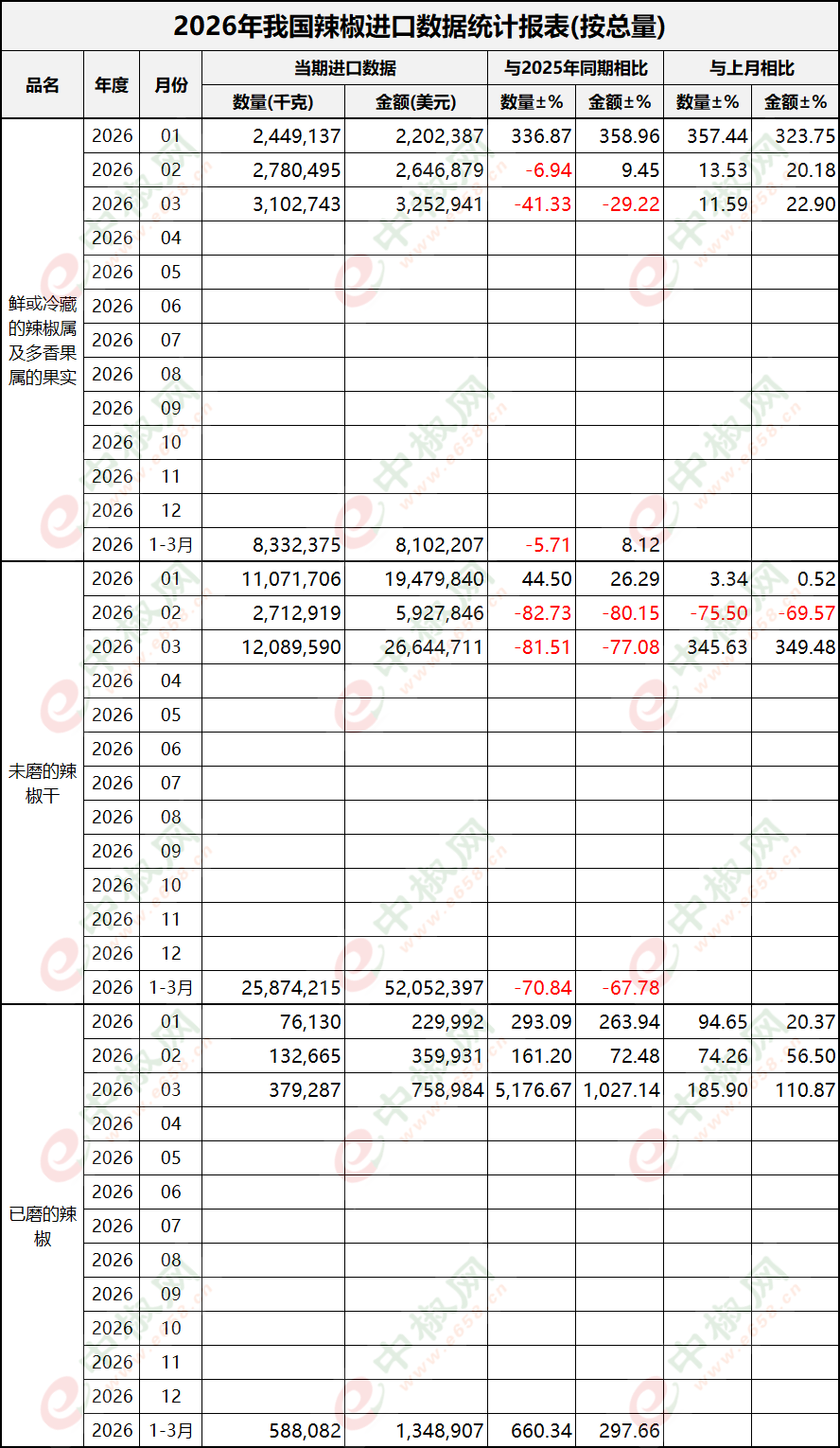 2026年3月辣椒进口数据(按总量)新