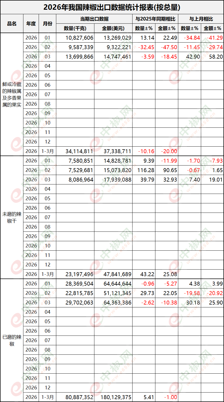 2026年3月辣椒出口数据(按总量)新