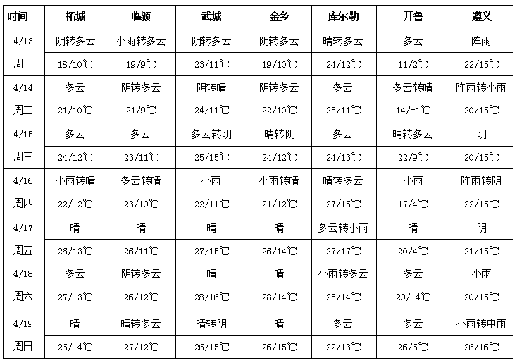 未来一周(4月13-19日),主要降雨区位于江南、华南以及西南地区东部等地,累计降水量有50~100毫米,其中江南南部、华南北部及贵州东南部的部分地区有110~150毫米;四川、江汉、江淮及西藏东南部等地累计降水量有20~40毫米,局地50毫米以上;新疆北部、东北地区中东部、华北南部、西北地区东部等地累计降水量有10~30毫米;上述大部地区降水量较常年同期偏多3~7成,部分地区偏多1倍以上。